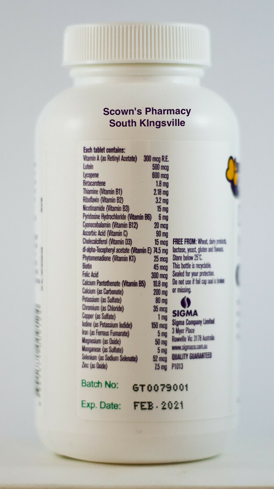 Ascorbic acid, betacarotene, Biotin, calcium carbonate, calcium pantothenate, chromic chloride hexahydrate, colecalciferol, cupric sulfate pentahydrate, cyanocobalamin, dl-alpha-tocopheryl acetate, ferrous fumarate, folic acid, heavy magnesium oxide, lutein,lycopene, manganese sulfate monohydrate, nicotinamide, phytomenadione, potassium iodide, potassium sulfate, pyridoxine hydrochloride, retinol acetate, riboflavin, sodium selenate, thiamine nitrate, zinc oxide