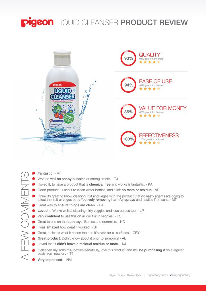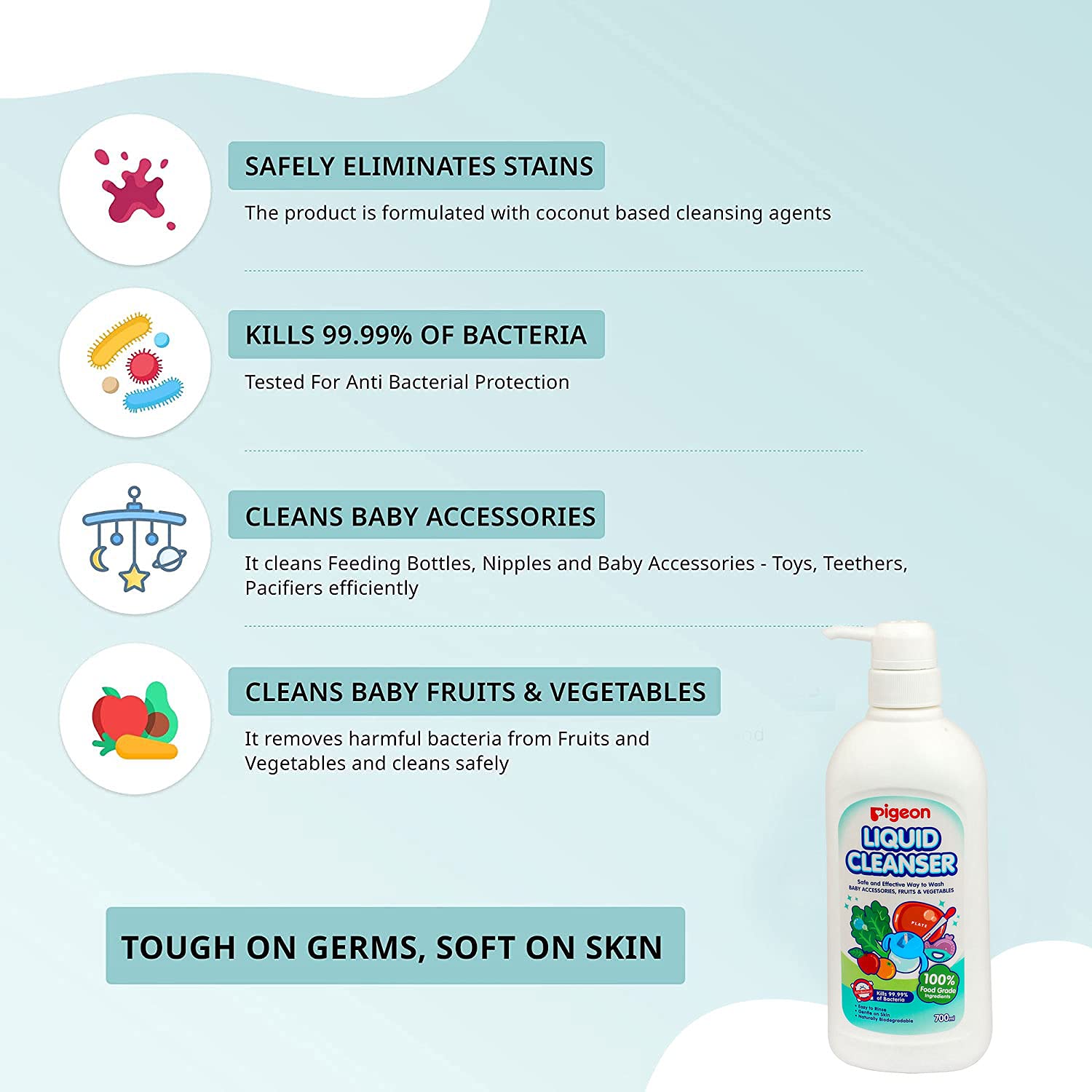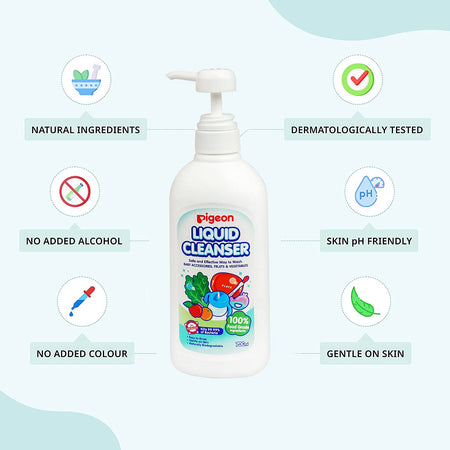 Pigeon Liquid Cleanser is a multi-use cleaning product for use on baby bottles, teats, toys and accessories. Use also to wash fresh fruit and vegetables.