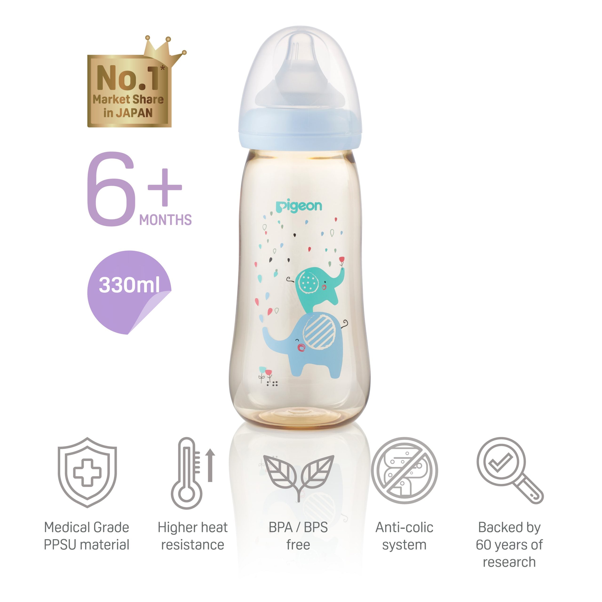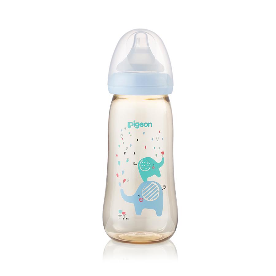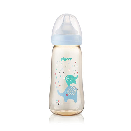 Pigeon Softouch Peristaltic Plus Wide Neck Bottle Elephant (PPSU) is a wide neck bottle with a cute Blue Elephant design. Use with Pigeon SofTouch Peristaltic PLUS teats. Made from medical grade plastic (PPSU; Polyphenylsulfone), SofTouch PPSU bottles are naturally honey toned and suitable for high use. The gold standard of plastic baby bottles.