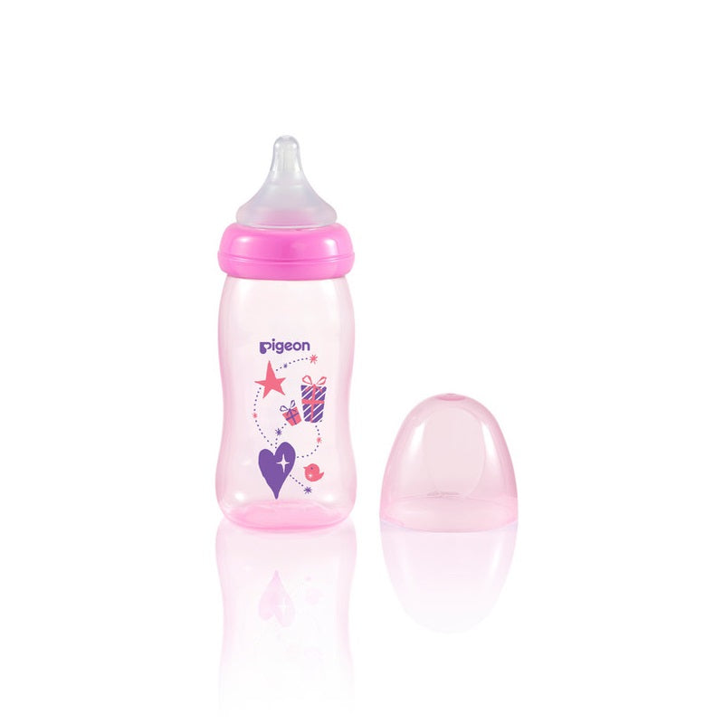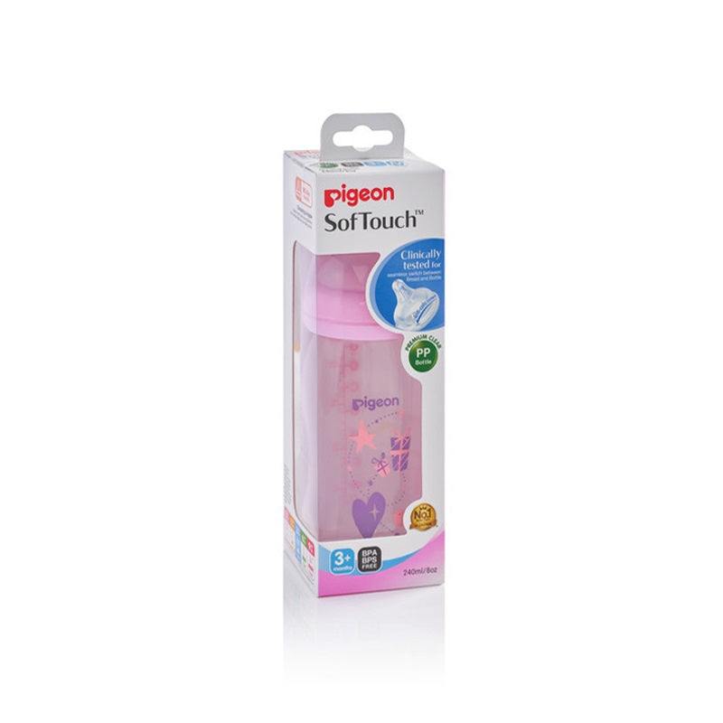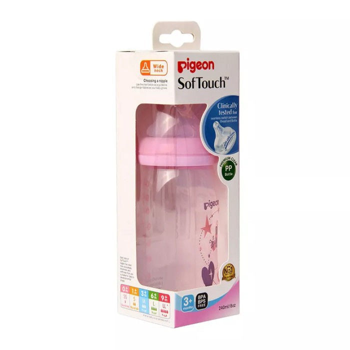 Pigeon Softouch Peristaltic Plus Wide Neck Bottle Pink (PP) is a wide neck bottle with a cute pink pattern. Use with Pigeon SofTouch Peristaltic PLUS teats. Made from light weight plastic, (PP: Polypropylene), the SofTouch PP bottle is suitable for low to regular use.