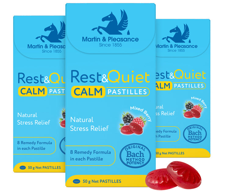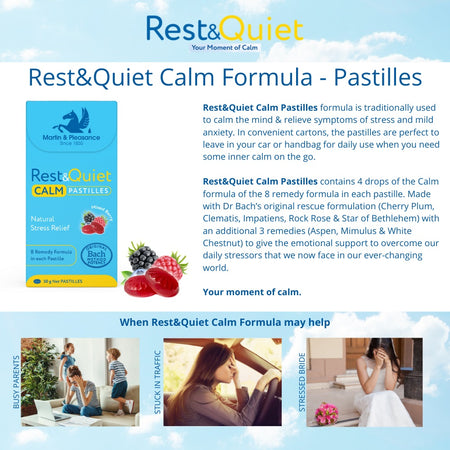 Rest&Quiet Calm Pastilles contains 4 drops of the Calm formula of the 8 remedy formula in each pastille. Made with Dr Bach’s original formulation (Cherry Plum, Clematis, Impatiens, Rock Rose & Star of Bethlehem) with an additional 3 remedies (Aspen, Mimulus & White Chestnut) to give the emotional support to overcome our daily stressors that we now face in our ever-changing world.