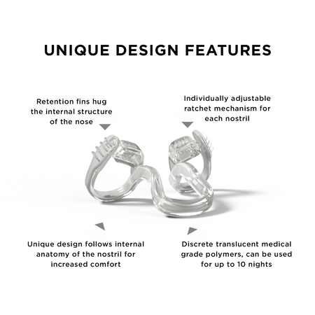 - Personalised Fit - Mute is the only nasal stent (dilator) that uses a patented dilation technology to further personalise the fit by adjusting the paddles from side to side.