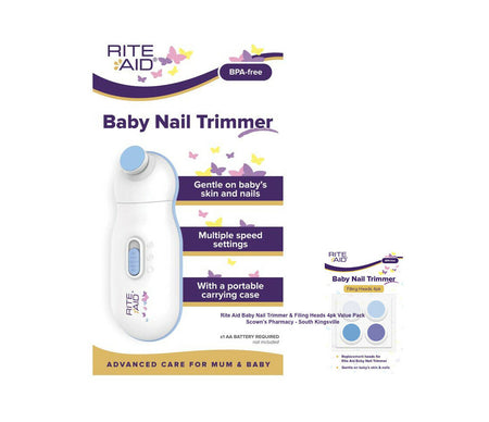 The Rite Aid Baby Nail Trimmer is designed for baby's soft nails. Moving away from the use of traditional nail clippers and scissors, its rotary filing function is completely safe for baby's sensitive skin and nails.