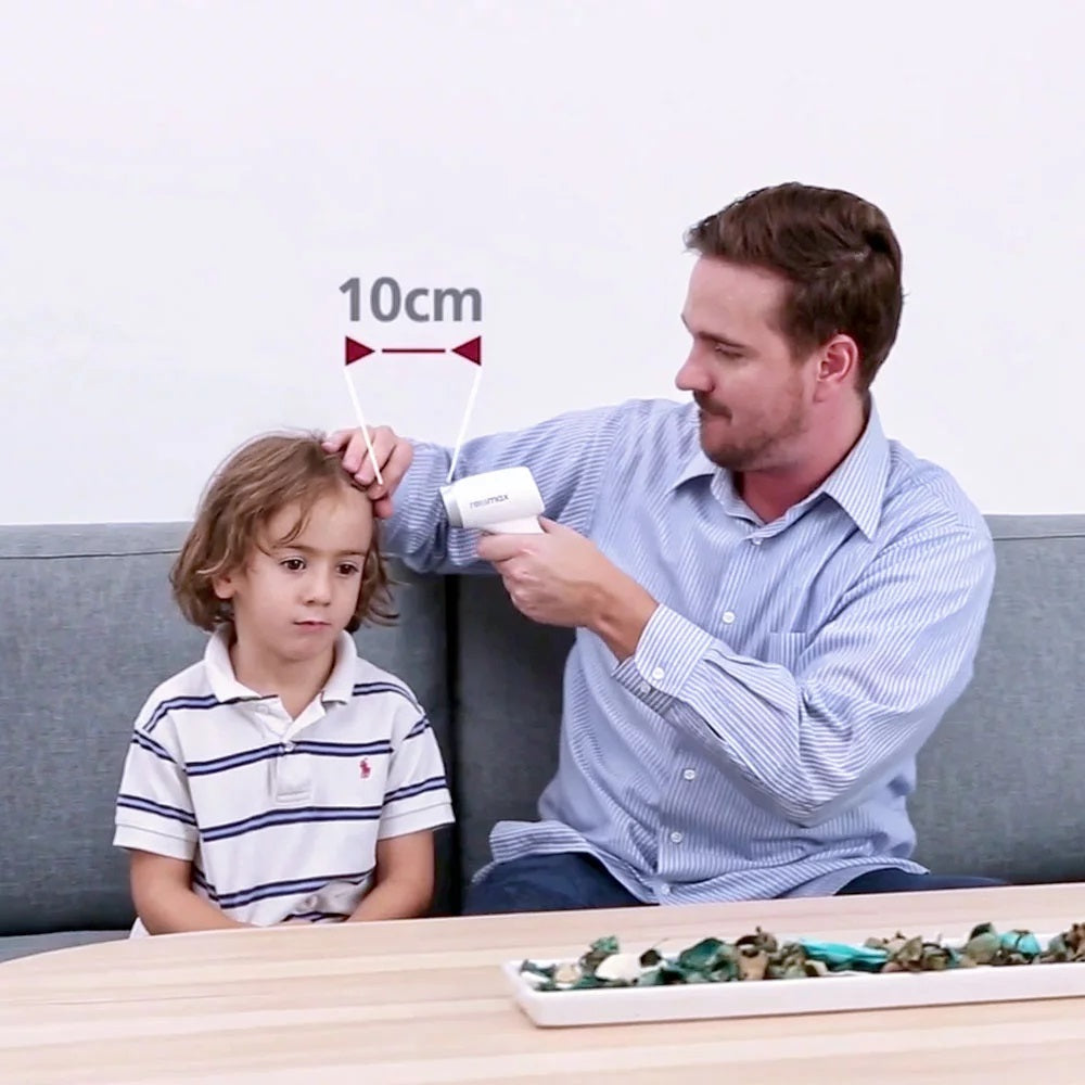 - Vertically aim the thermometer at the temple with a distance of less than 10 cm. If the temple is covered with hair, sweat or dirt, remove the obstacle from the temple to improve the measuring accuracy.