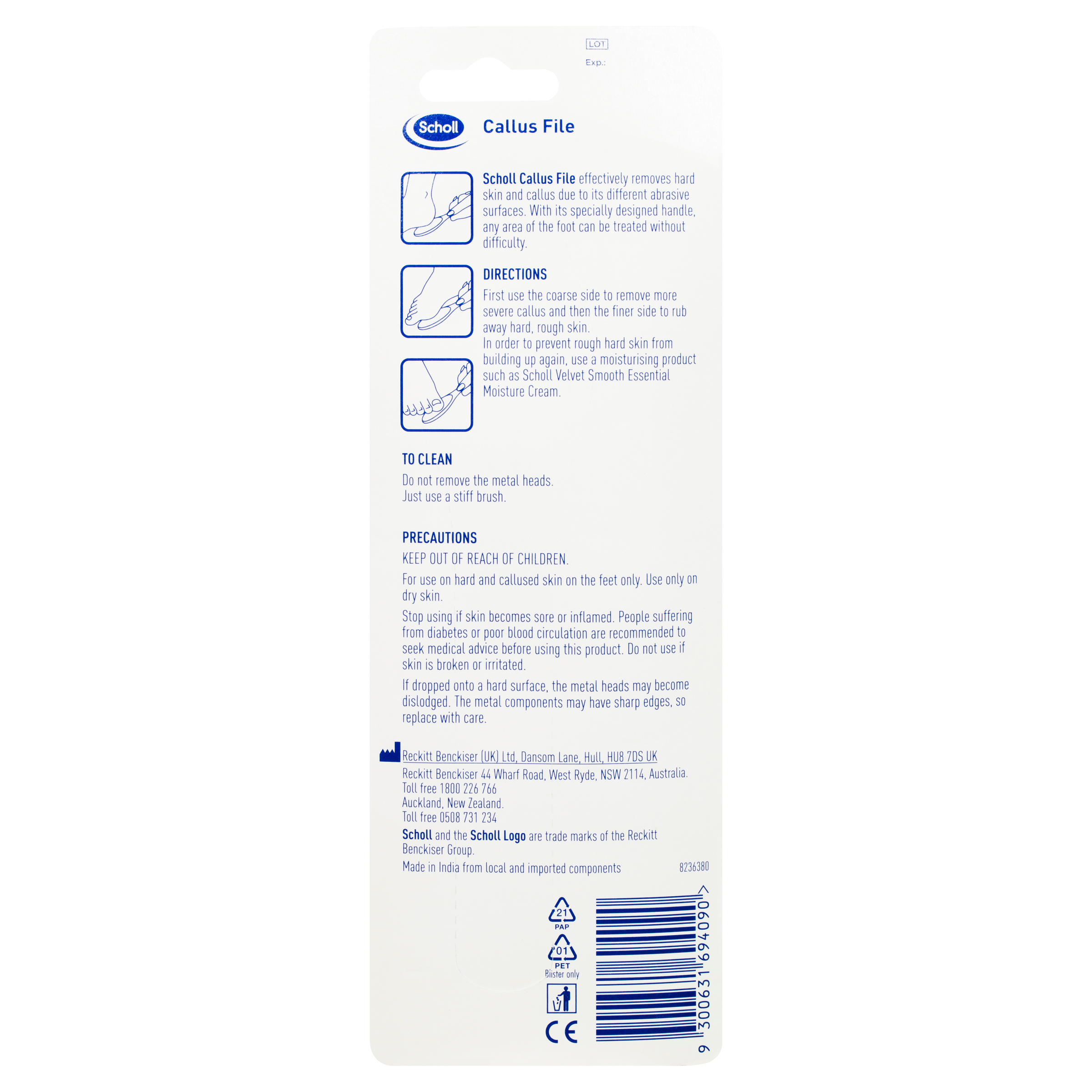 First use the coarse side to remove more severe callus and then the finer side to rub away hard, rough skin. In order to prevent rough hard skin from building up again, use a moisturising product such as a Scholl deep moisturising cream.