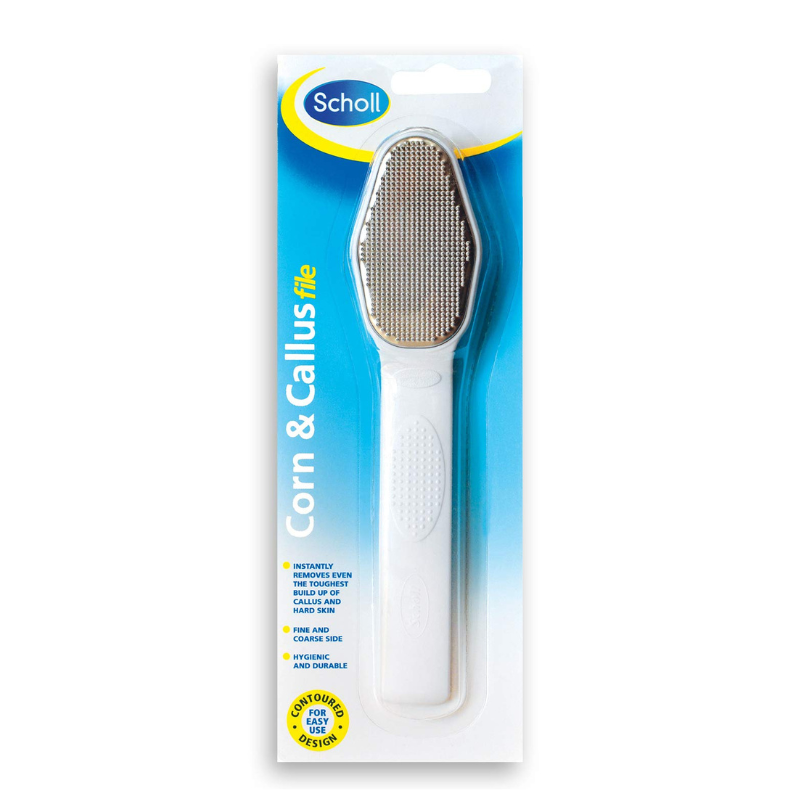 Scholl Corn & Callus File, effectively remove all degrees of hard skin, corn and callus due to its two different abrasive surfaces. With its specially designed handle, any area can be treated without difficulty.