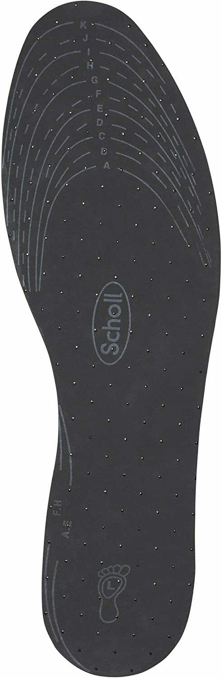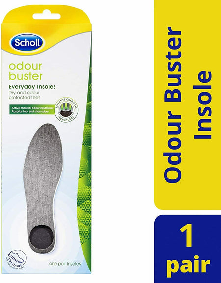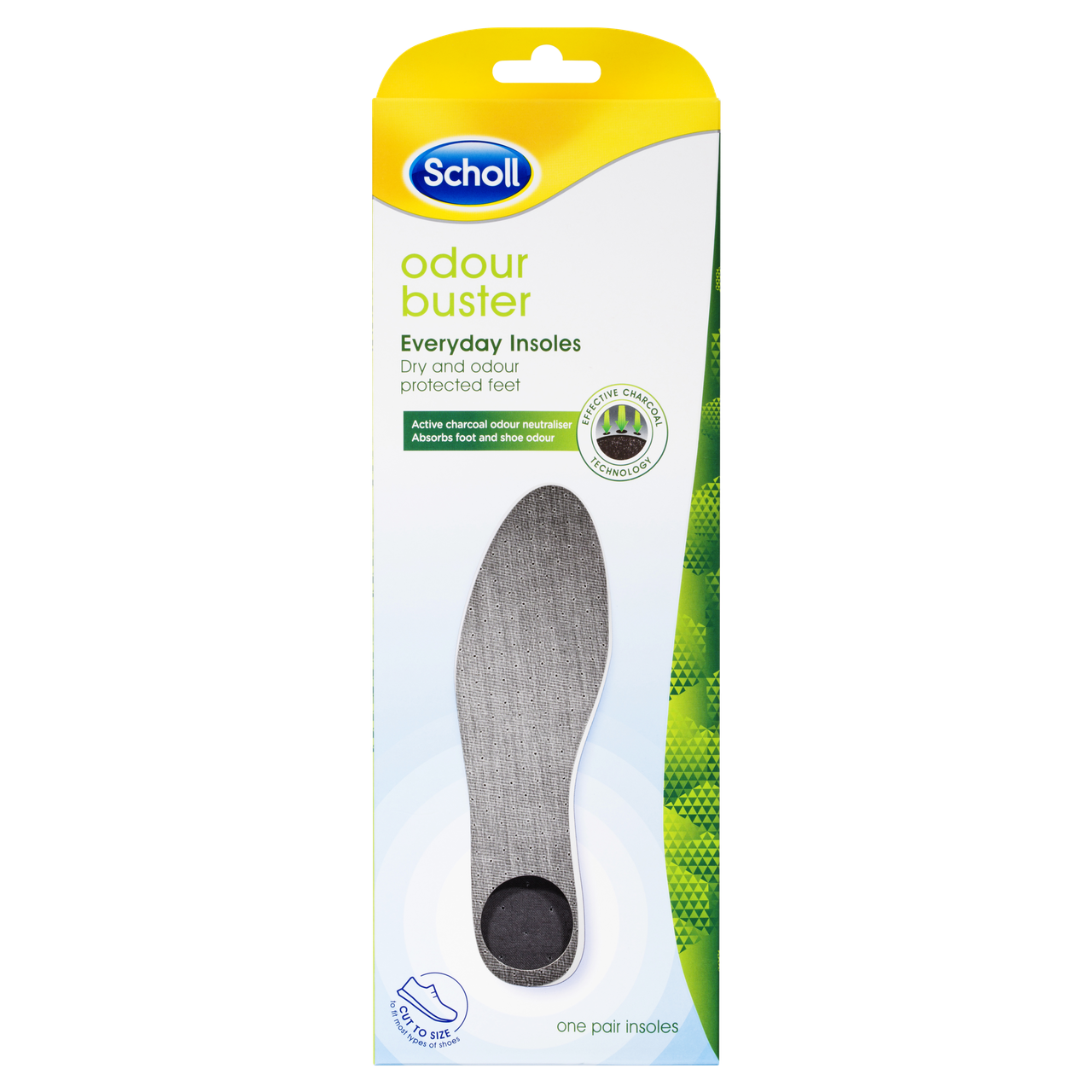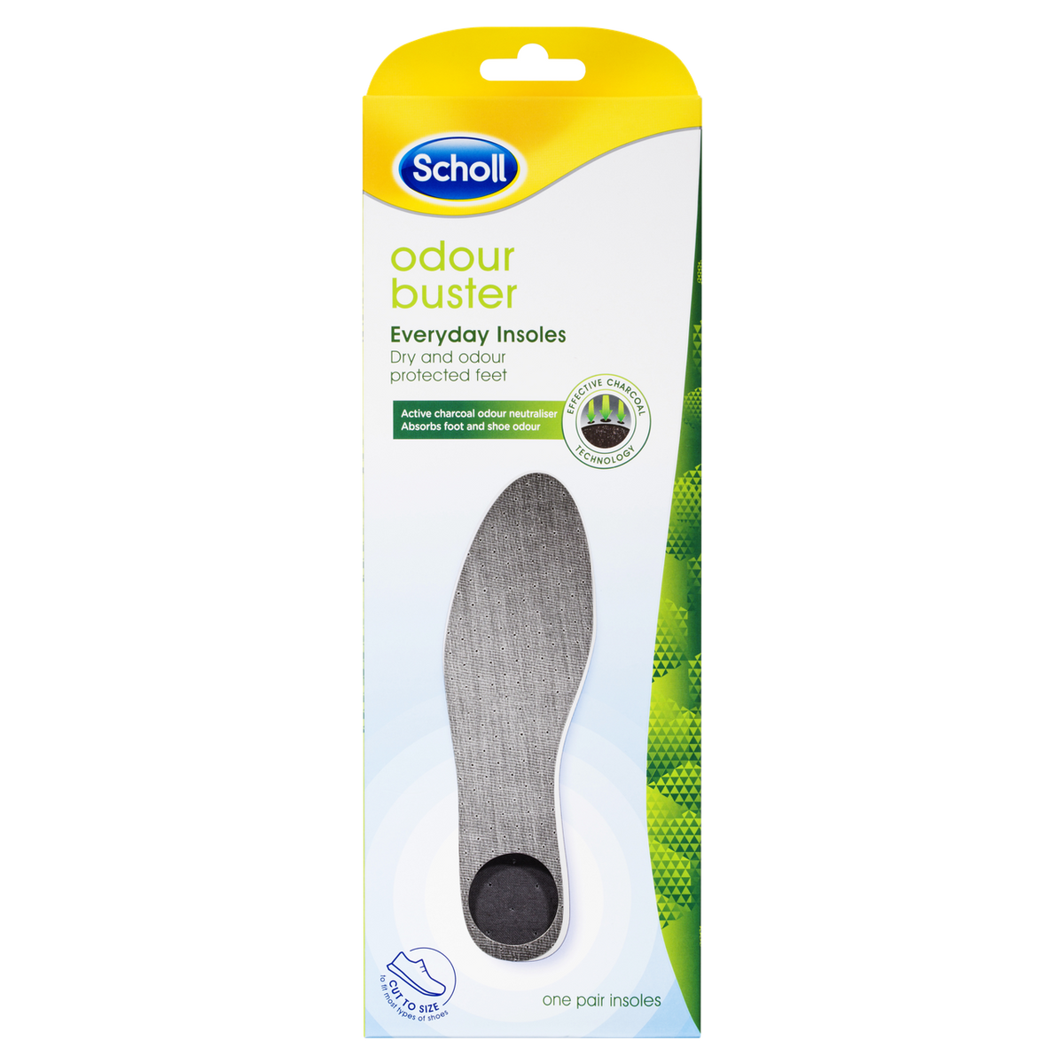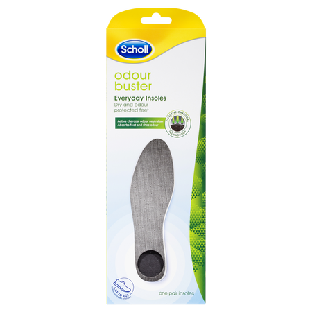 Scholl Odour Buster Everyday Insoles absorb perspiration to keep feet dry and the active charcoal odour neutraliser absorbs foot and shoe odour.