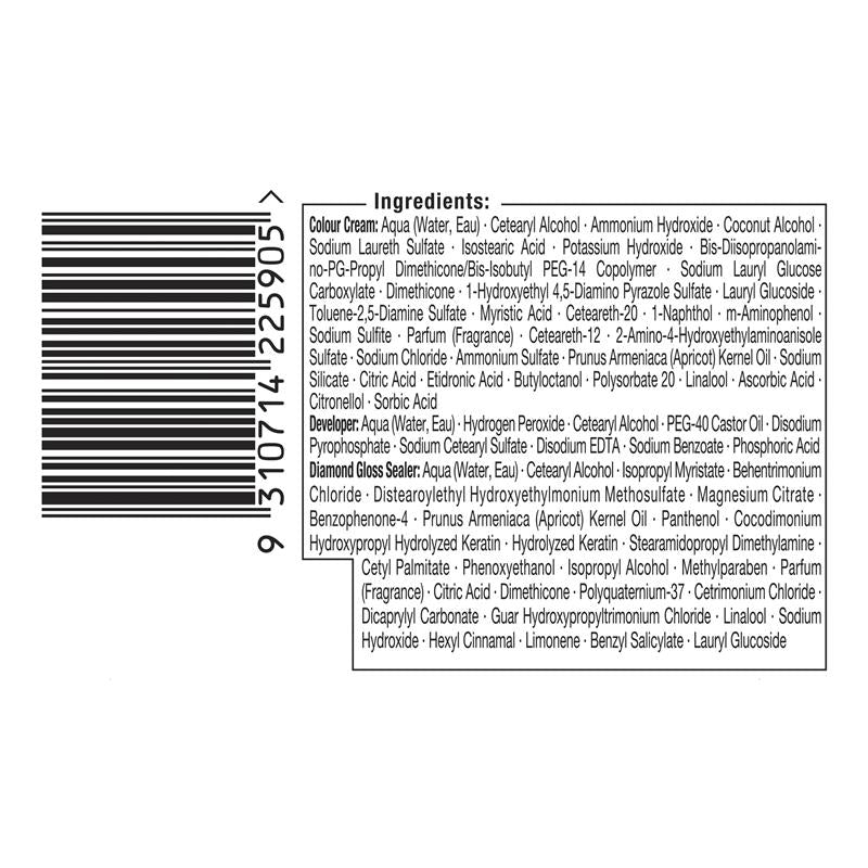 The high-performance hair colour formula provides you with perfect grey coverage and irressistible colour intensity for up to 10 weeks. The Diamond Gloss Sealer post-colour treatment contains Keratin and Apricot Kernel Oil for healthy-looking, stronger hair. it locks in the colour the colour pigments and helps your colour stay more vibrant for longer. Now in a tube for easy application and multiple uses.