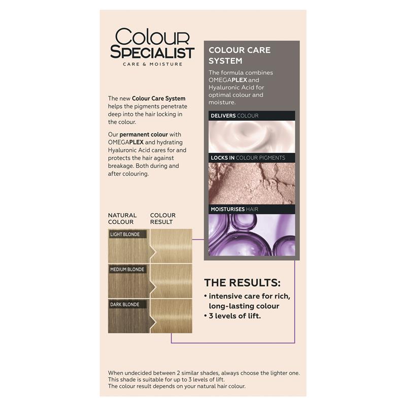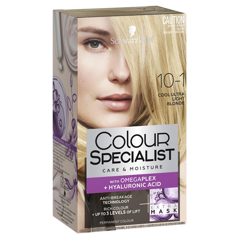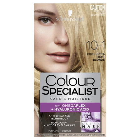 Schwarzkopf Colour Specialist 10.1 Cool Ultra Light Blonde contains Omegaplex which protects & reinforces against damage, strengthens micro-bonds inside hair fibre and offers extra long-lasting blonde - up to 4 levels of lift.