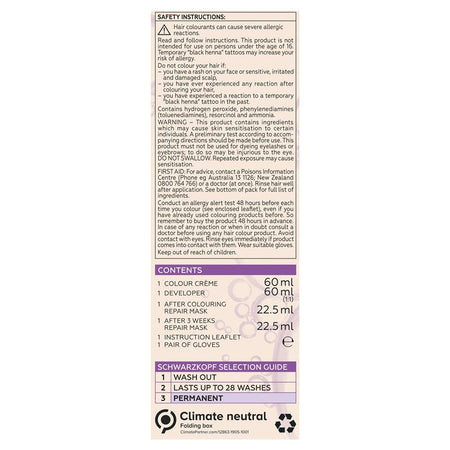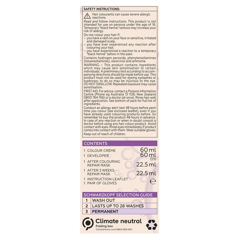 Conduct an allergy alert test 48 hours before each time you colour (see enclosed leaflet, even if you have already used colouring products before. So remember to buy the product 48 hours in advance. In case of any reaction or when in doubt consult a doctor before using any hair colour product. Keep out of reach of children.