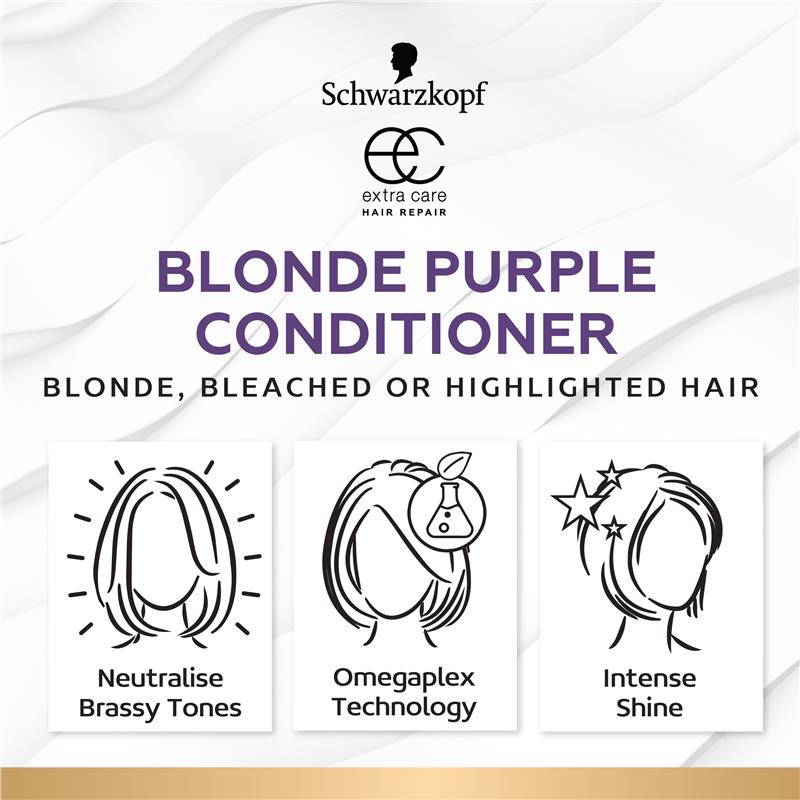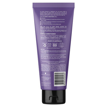 Schwarzkopf Extra Care Blonde Anti-Yellow Toning Purple Conditioner is formulated with Anti-Yellow Technology with intense violet pigments to neutralise any remaining yellow & brassy tones. With Omegaplex Antibreakagetechnology + Blueberry Extract for hair repair & stronger hair.