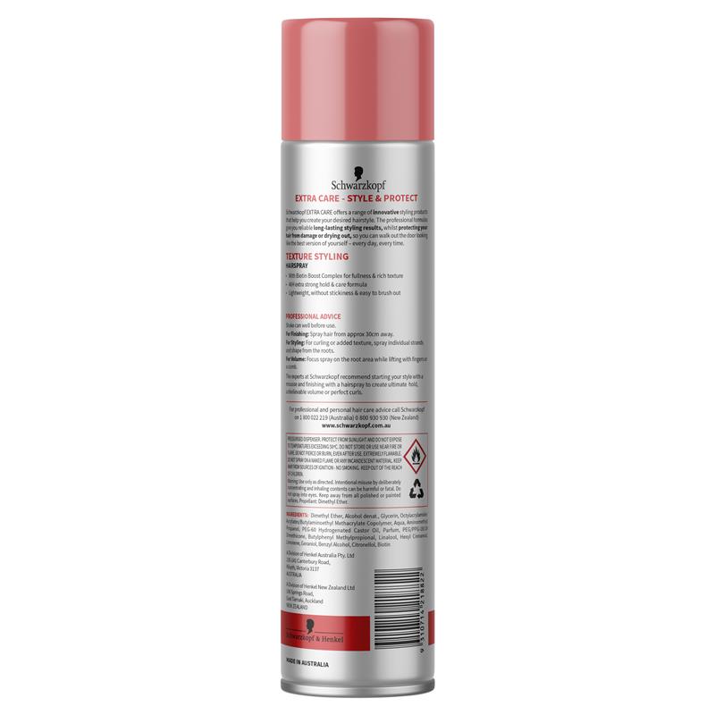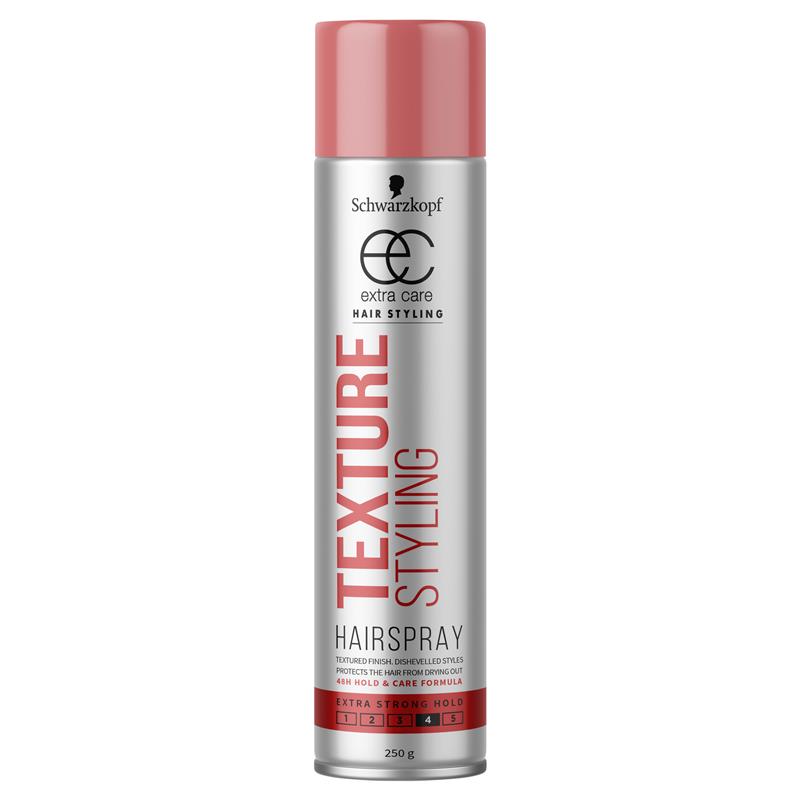 Schwarzkopf Extra Care Texture Styling Hairspray provides extra strong hold, gives hair body with rich texture for 100% fortifying hold.