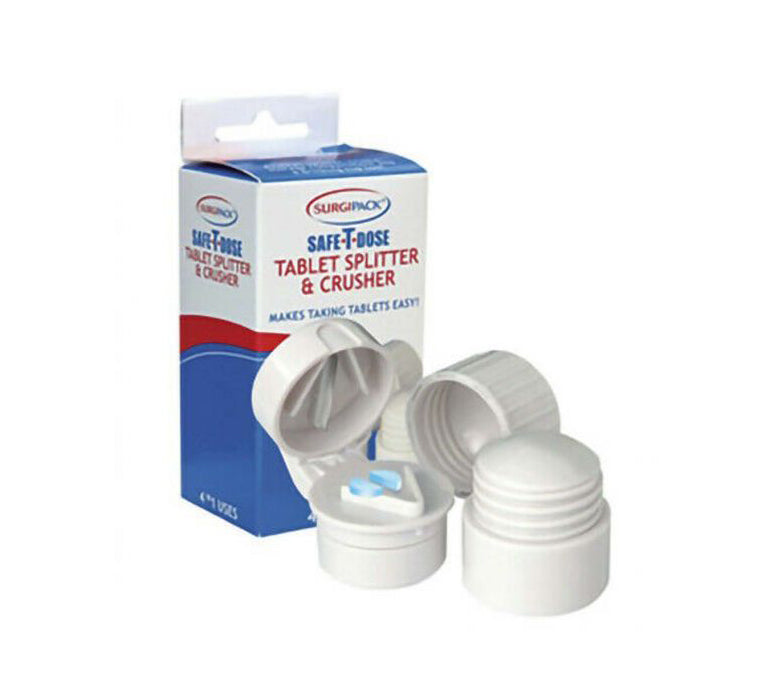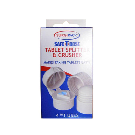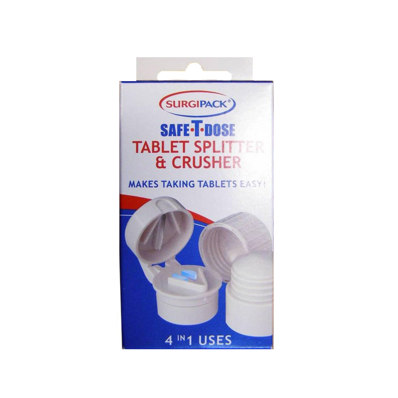 Surgipack 6053 Safe T-Dose Tablet Splitter & Crusher makes taking pills easier. It is a handy all in one tool that has a stainless steel blade in lid for splitting pills and a built in storage area. Its compact size separates easily, can crush pills in one twist, and its bottom serves as a drinking cup.