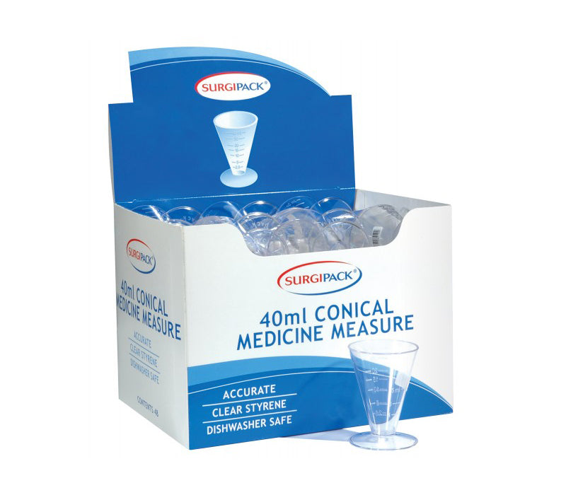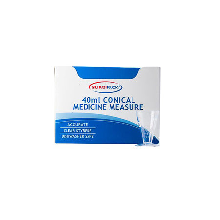 Surgipack 6419 Conical Medicine Measure is a plastic conical shaped medicine measure graduated to 40ml. A device designed to assist measuring quantity of volume (liquid).