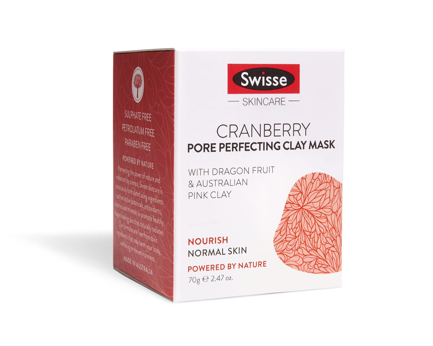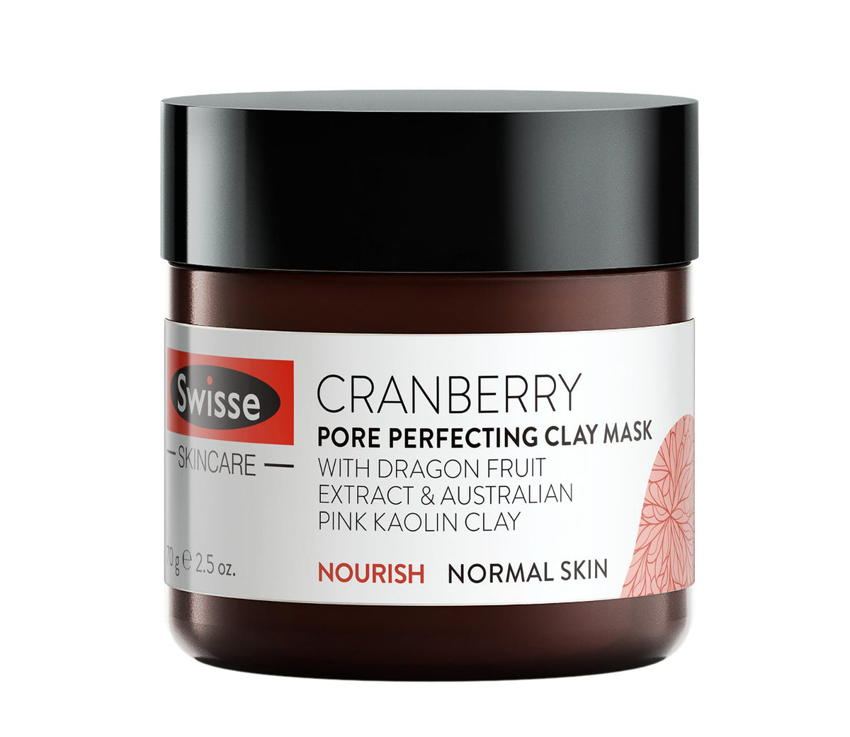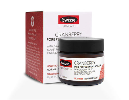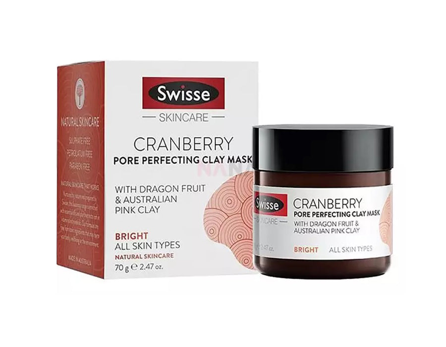 Swisse Cranberry Pore Perfecting Clay Mask is formulated with Dragon Fruit Extract and Australian Kaolin Clay for a luxurious facial treatment. It helps cleanse, remove dead skin cells and minimize the appearance of pores for a smooth and fresh complexion.
