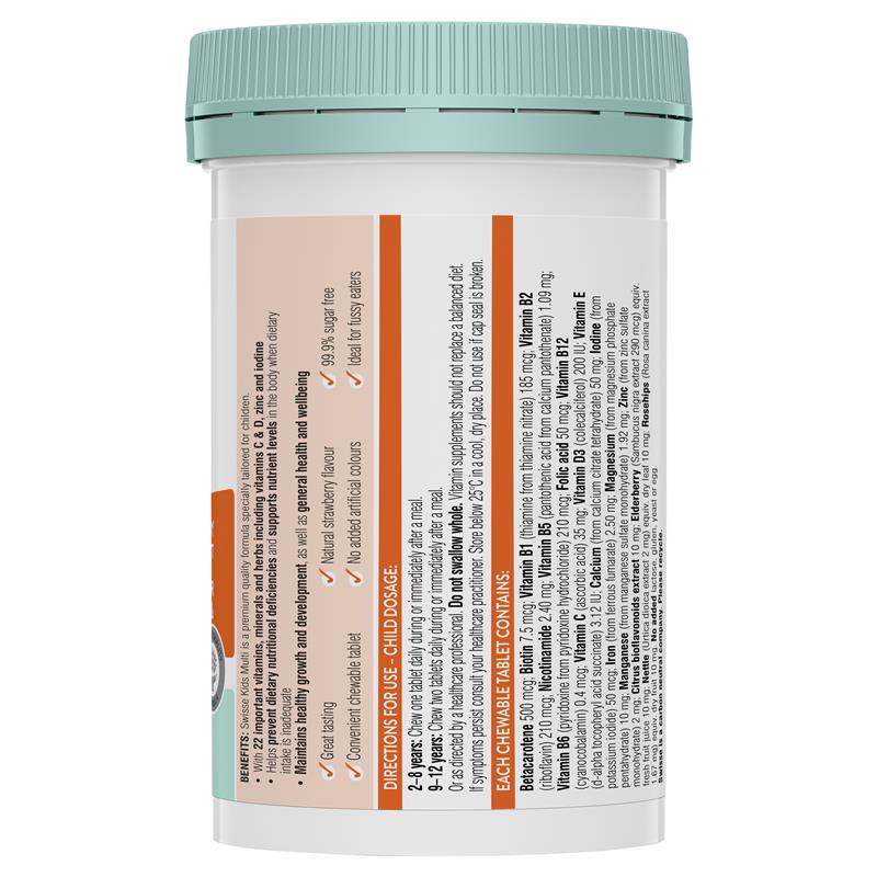 Swisse Kids Multi bursting with 22 important vitamins, minerals and herbs, including vitamin C and D, zinc and iodine. Swisse Kids Multi is specifically tailored for growing bodies. This great-tasting chewable formula provides nutritional support for general wellbeing, maintains healthy growth and development, and helps fill nutritional gaps where dietary intake is inadequate.