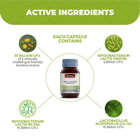Swisse Ultibiotic Daily Digestive Probiotic is a premium quality formula combining three clinically trialled* strains—Bifidobacterium lactis (HN019), Bifidobacterium lactis (BI-04) and Lactobacillus acidophilus (La-14) —specifically formulated to: