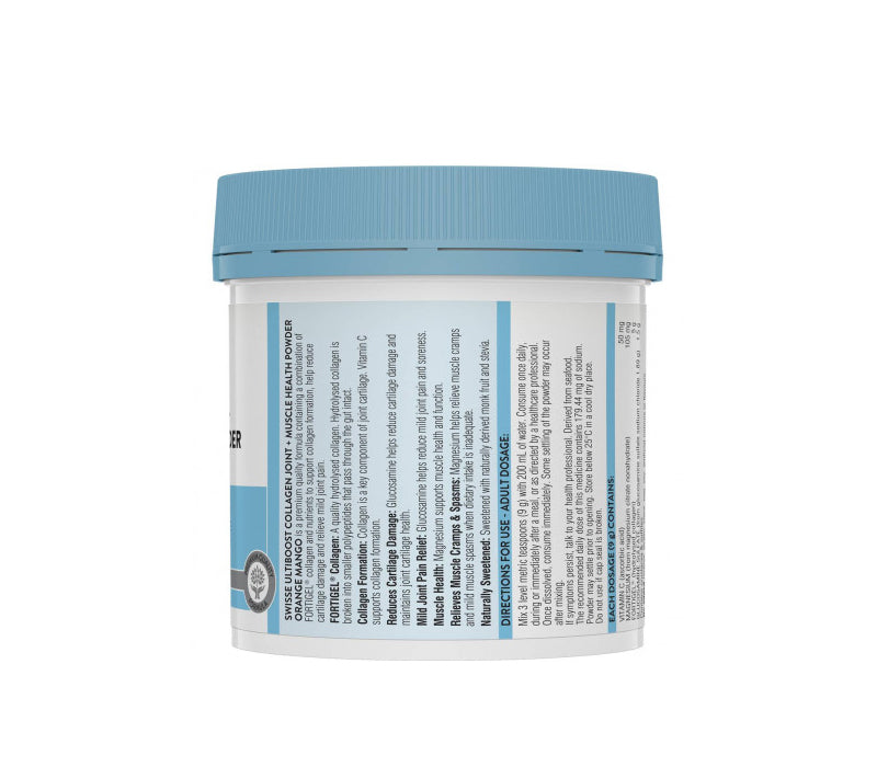 Swisse Ultiboost Collagen Joint + Muscle Health Powder is a premium quality formula containing a combination of Fortigel collagen and nutrients to support collagen formation, help reduce cartilage damage and relieve mild joint pain.