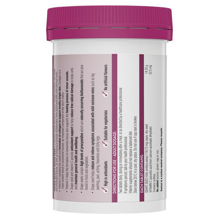 - Grape Seed: Grape seed helps reduce and relieve symptoms associated with mild varicose veins such as swelling, pain, aching, heaviness and itchy legs. It provides antioxidant support/contains antioxidants and maintains general health and wellbeing. This herbal ingredient contains high levels of procyanidins, the naturally occurring bioflavonoids also found in fruits and vegetables.