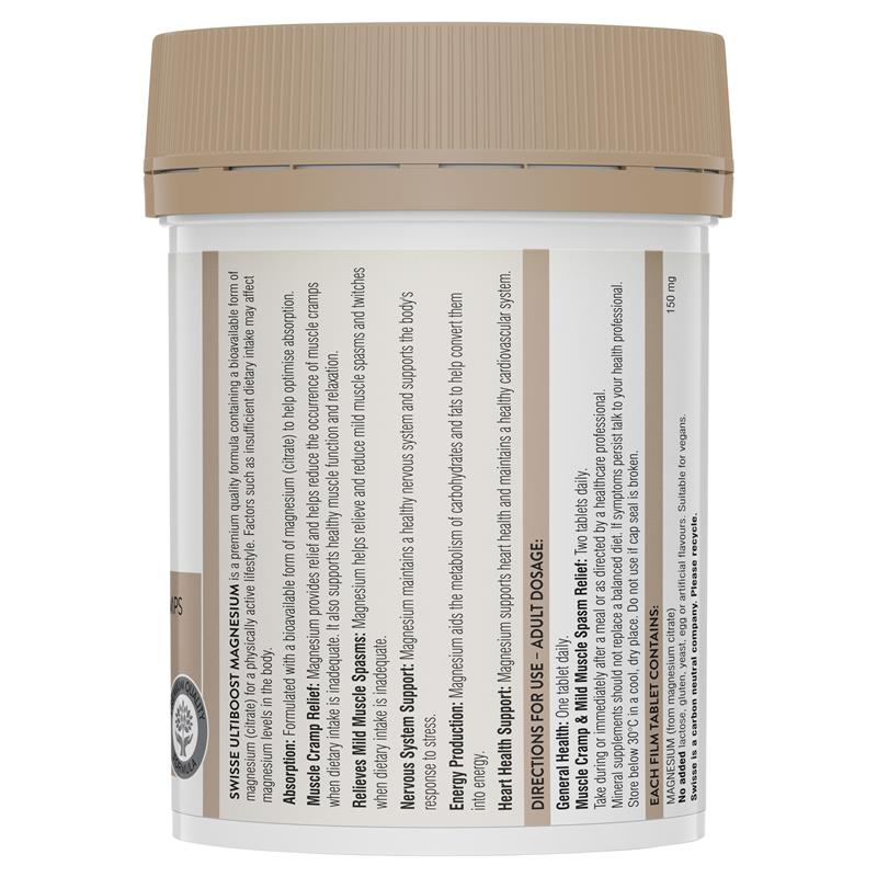 Swisse Ultiboost Magnesium is a premium quality formula containing a bioavailable form of magnesium (citrate) for a physically active lifestyle. Factors such as insufficient dietary intake may affect magnesium levels in the body.