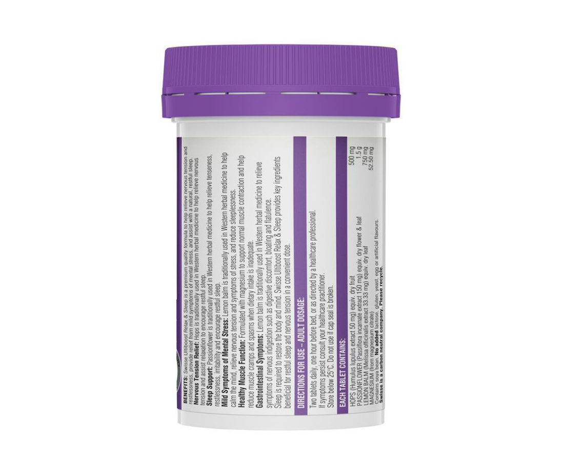 Swisse Ultiboost Relax & Sleep a premium quality formula containing Hops, Passionflower and Lemon balm, traditionally used in Western herbal medicine to help relieve nervous tension, reduce sleeplessness and assist with a natural, restful sleep.