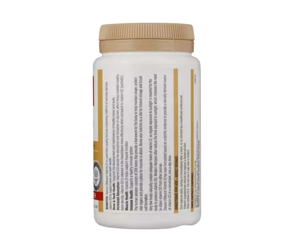 Regular exposure to sunlight is required for the body to produce vitamin D3. Modern lifestyles often reduce the time exposed to sunlight. Swisse Ultiboost Vitamin D can help maintain vitamin D levels in the body when sun exposure is inadequate.