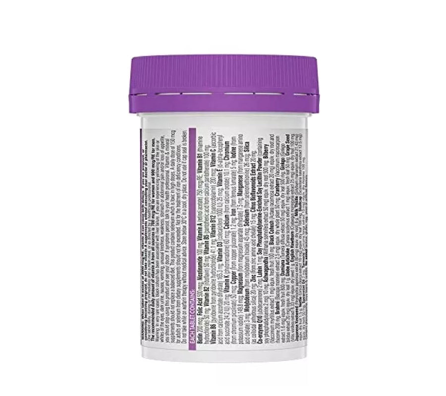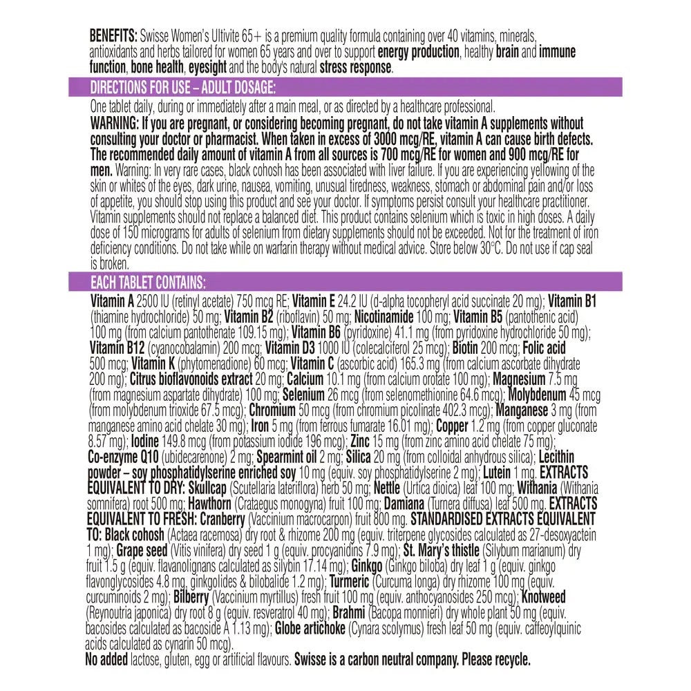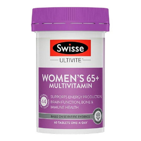 Swisse Ultivite Women’s 65+ Multivitamin is a premium quality formula containing over 40 vitamins, minerals, antioxidants and herbs tailored for women 65 years and over. It supports energy production, healthy brain and immune system function, bone health, healthy vision and stress response in the body.