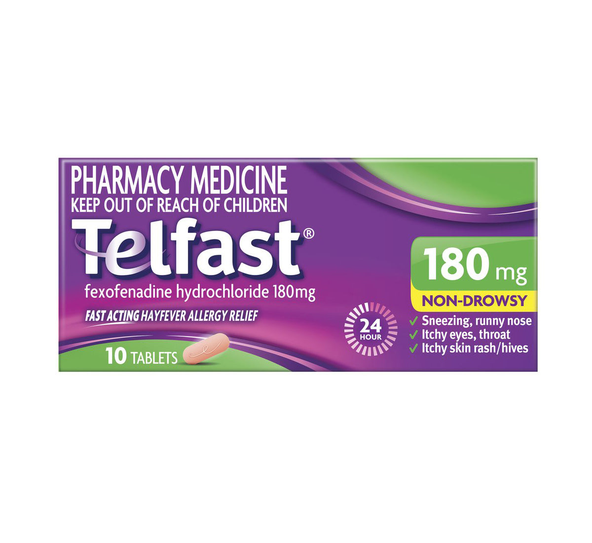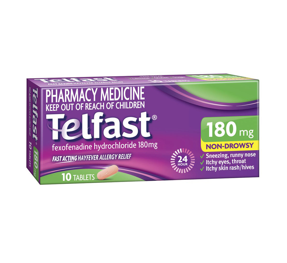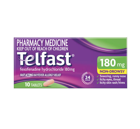 Telfast 180mg Hayfever Allergy Relief - Fast, non drowsy relief of the symptoms of hayfever allergies and itchy skin rash or hives. With just one tablet a day you can get on with your day without worrying about your allergies.