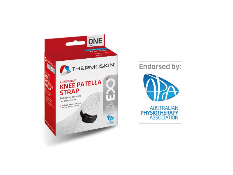 Thermoskin EXO Adjustable Knee Patella Strap designed to place pressure below the knee and support the patella and tendon, reducing the load and helping prevent injury. The adjustable strap can be tightened from either side to ensure proper fit and placement of the supporting gel pad.
