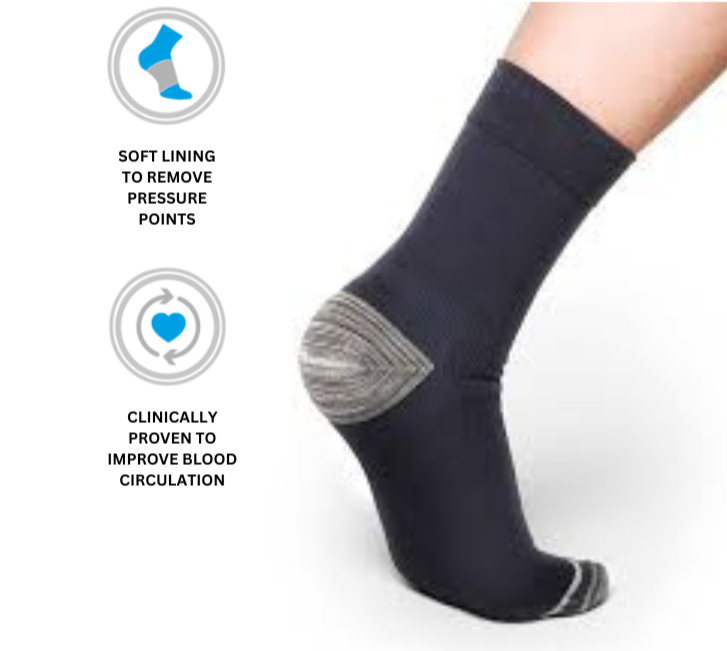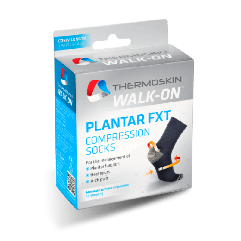 Thermoskin FXT Crew Compression Socks is designed with targeted compression zones to aid in the pain management and relief from plantar fasciitis, heel spurs and arch pain. Ideal for those on their feet all day.