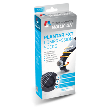 Thermoskin Plantar FXT Compression Socks Calf Length is Anatomically designed compression zones target the feet and calves, for the advanced pain management of plantar fasciitis, Achilles tendonitis, arch pain and heel spurs. Also ideal for sports performance, sports recovery, shin splints, standing or sitting all day, travel, varicose veins and swollen or tired aching legs.