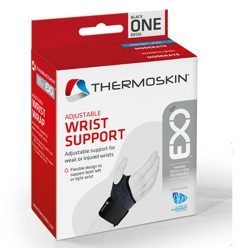 Thermoskin Adjustable Wrist Support is designed to provide flexible support for both the left and right wrist. The EXO™ thermo regulation material allows for increased warmth to manage pain, offering comfort for everyday wear.