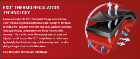 A new innovation to the Thermoskin range our exclusive EXO thermo regulation material releases energy in the form of heat. EXO converts moisture into heat, working to provide increased muscle temperature and blood flow to aid in recovery. This is effective in the management of pain and injuries to soft tissue. The EXO range helps to maintain a lightweight feel by converting moisture away from the skin, giving a longer more comfortable wear.