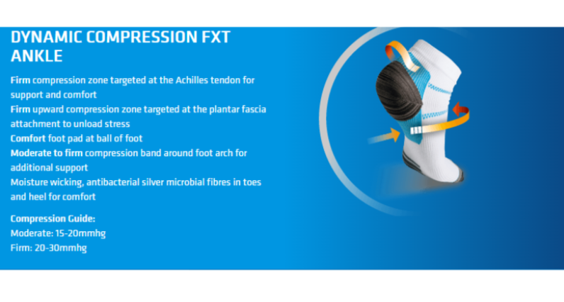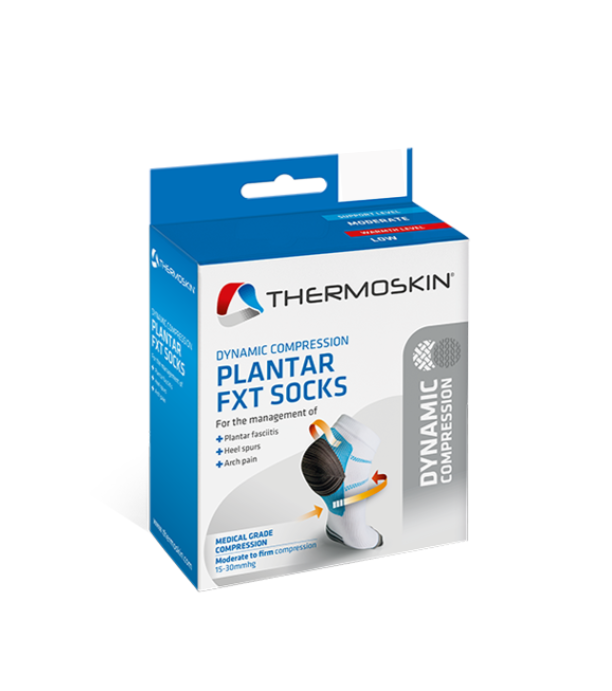 Thermoskin Dynamic Compression Plantar FXT Socks Ankle is designed with targeted compression zones to aid in the pain management and relief from plantar fasciitis, heel spurs and arch pain. Ideal for sports or those on their feet all day.
