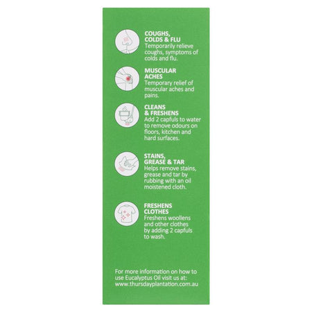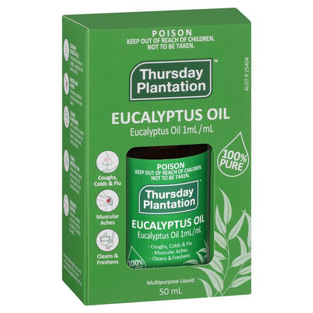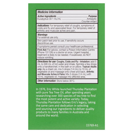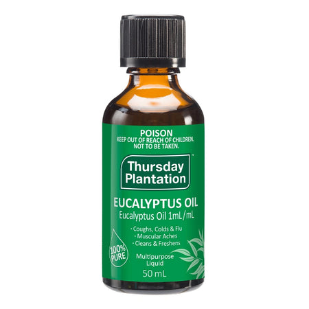Thursday Plantation Eucalyptus Oil Pure is a pharmaceutical grade oil with a wide range of personal and household uses. Helps relieve cold & flu symptoms and brings relief to aching muscles when used in inhalation or when diluted in a massage oil as a chest rub. Temporarily relieves mild arthritic and muscular aches and pains when blended in a massage oil. Also cleans floors kitchen and bathroom surfaces without the use of nasty chemicals.