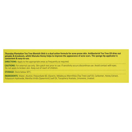 Thursday Plantation Tea Tree Blemish Stick With Manuka Honey features a dual-action formula that combines the power of 100% pure, Australian-grown Tea Tree oil with Manuka Honey.