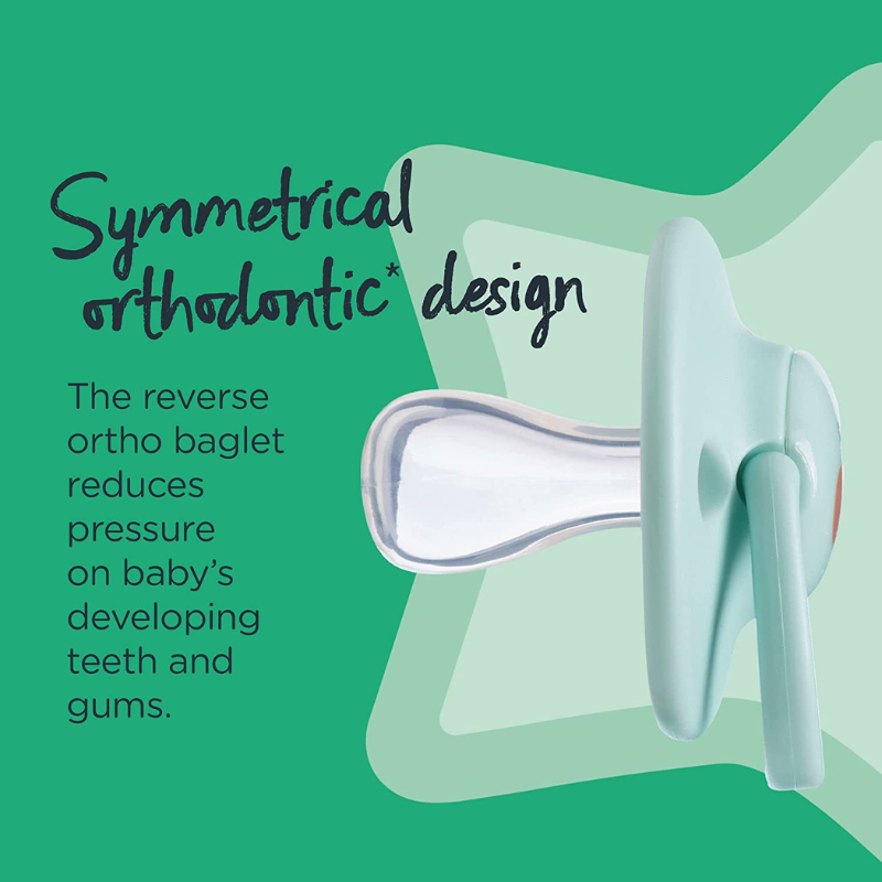 Our orthodontic** Anytime soothers feature an oval, reverse ortho baglet that is vented meaning it compresses more easily than traditional, air-filled baglets and therefore reduces pressure on baby’s developing teeth and gums. The symmetrical, soft silicone baglet that is fully reversible and has no ‘wrong’ side-up so the soother will always be placed correctly in your baby’s mouth, even when baby puts the soother in their mouth themselves.