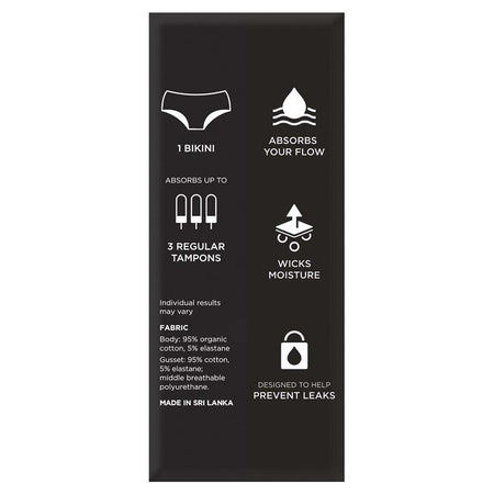 Sleek and stylish bikini cut made with cotton means that you don't have to compromise comfort and style for protection. Bikini cut that’s thin and comfortable with the absorbency of up to 3 regular tampons! Amazing if you have a light or moderate flow.
