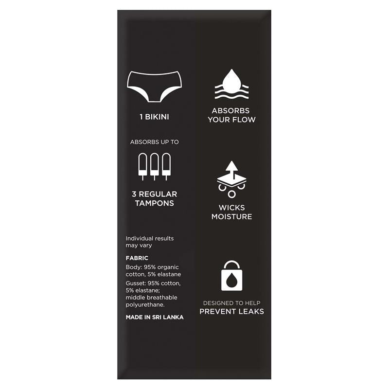 Sleek and stylish bikini cut made with cotton means that you don't have to compromise comfort and style for protection. Bikini cut that’s thin and comfortable with the absorbency of up to 3 regular tampons! Amazing if you have a light or moderate flow.