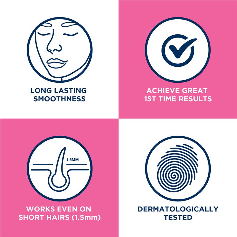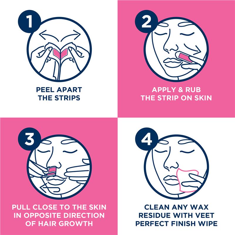 Veet Easy-Gel Face Wax Strips With Almond Oil - face the world with confidence with Veet Wax Strips for your face, giving you touchable smoothness as part of your beauty routine. Ideal for small and delicate areas like your upper lip, cheeks and chin. They’re specially formulated with Almond Oil and Vitamin E. And they’re easy to use – the special Easy Grip™ tab means you can get results that last up to four weeks. Veet Wax Strips for the face work even on short hair – and, with regular use, you’ll get fewer, finer and softer hairs growing back.
