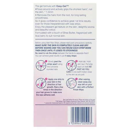 Veet Easy-Gel Legs Wax Strips gives confidence to achieve great 1st time results, even for those inexperienced with wax strips. Enjoy the pleasant gel texture on the skin, delightful aroma and beautiful colour. Specially formulated with Shea Butter, known for its moisturizing properties and fragranced with Acai berry.