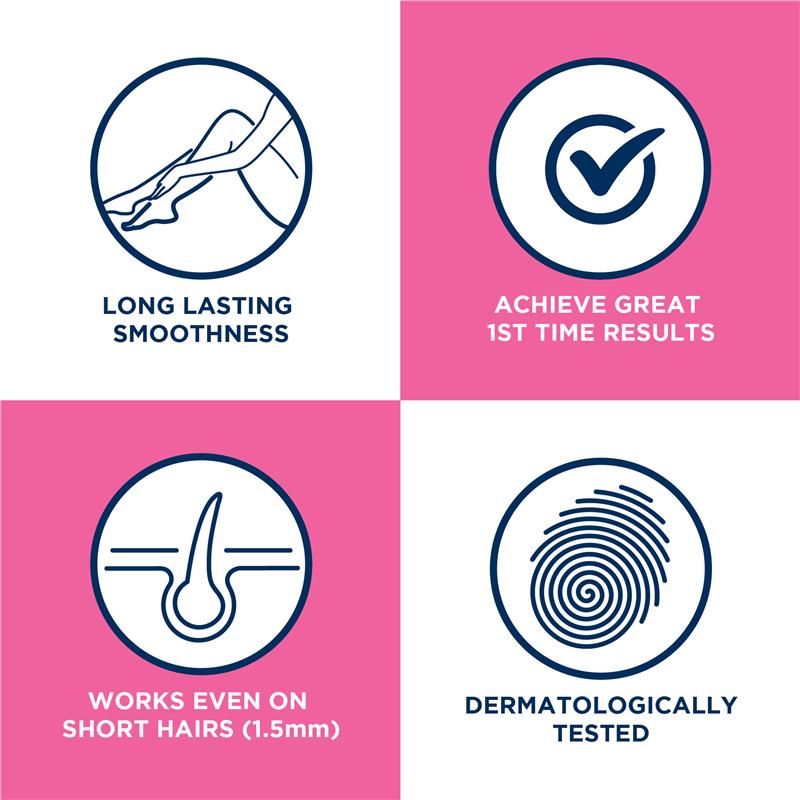 - Suitable for use on the legs, arms, underarms and bikini line.