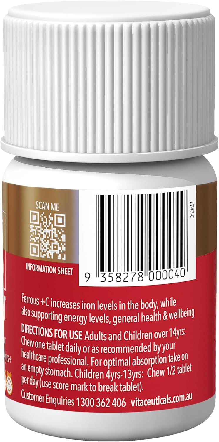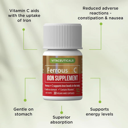 Vitaceuticals Ferrous + C, is a premium Iron Supplement which is gentle on the stomach and has vitamin C to help with the body’s absorption of Iron
