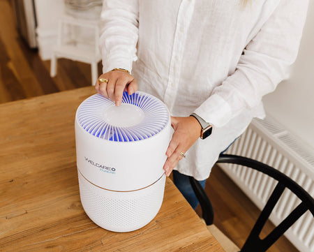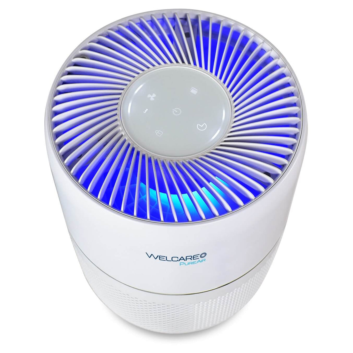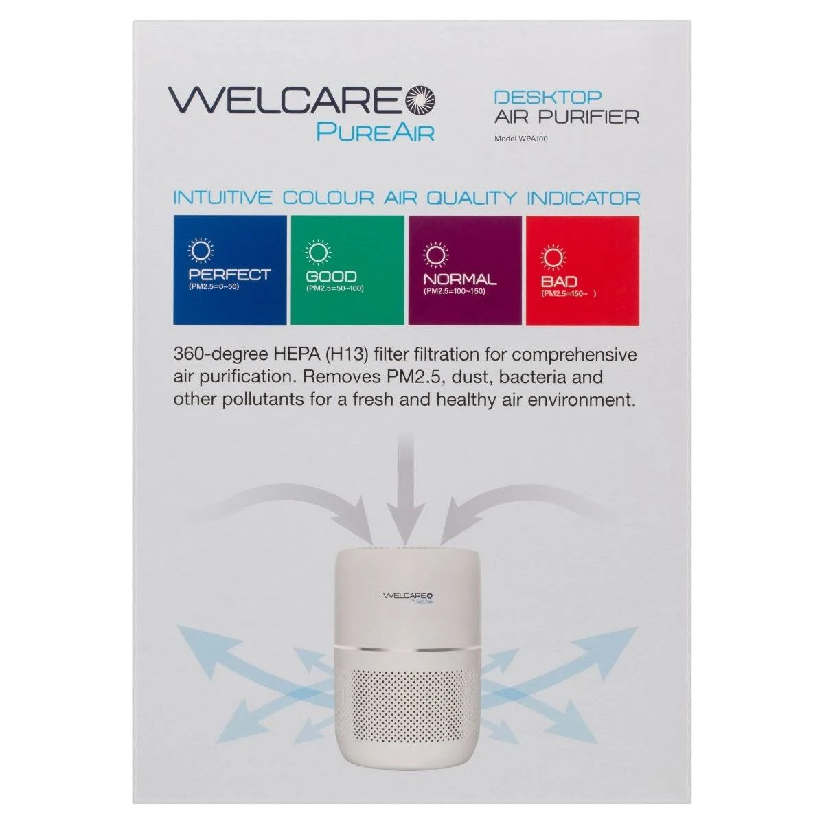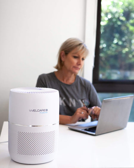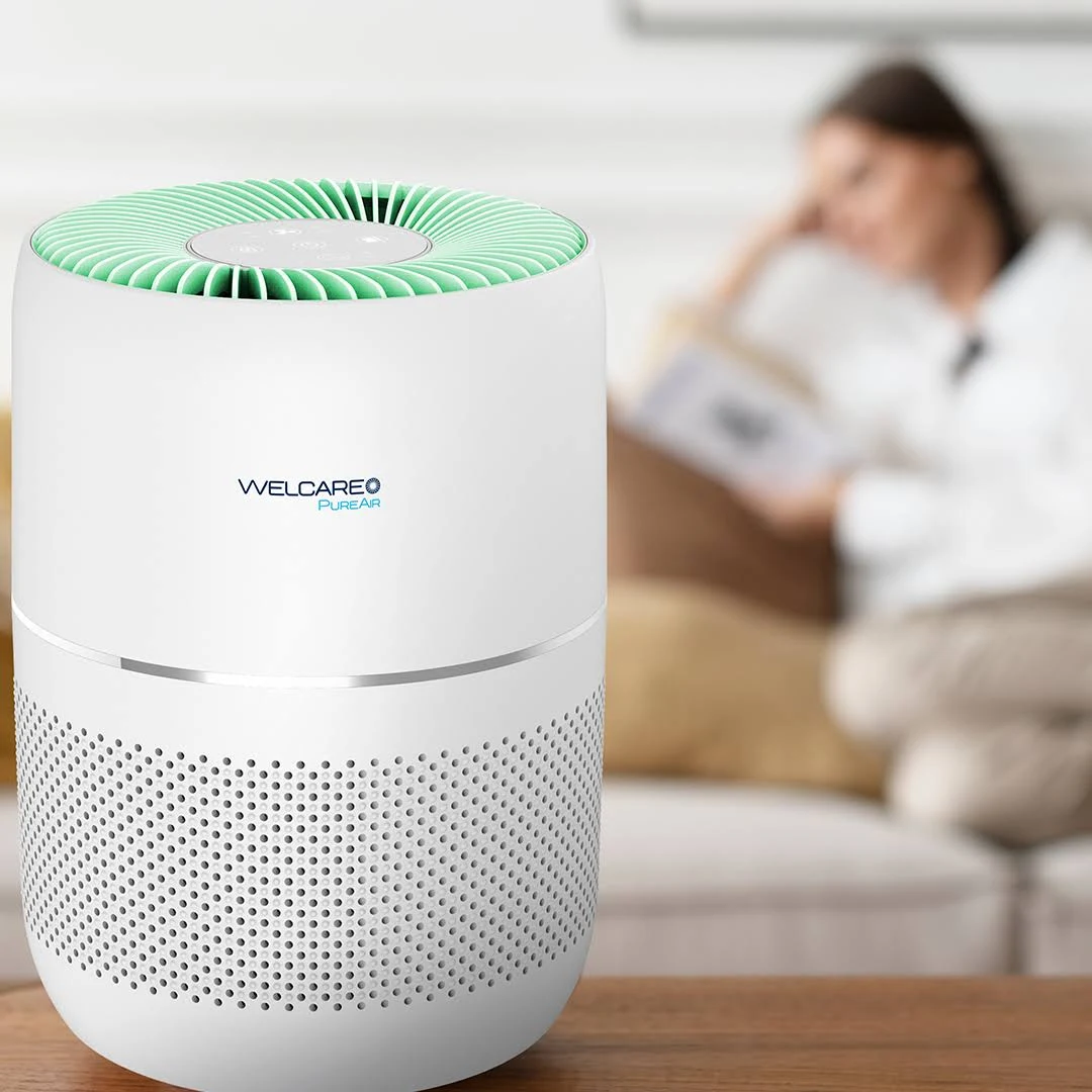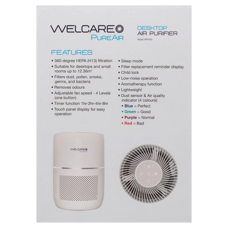 The Welcare PureAir Desktop Air Purifier harnesses the power of a 360-degree 3 IN 1 HEPA (H13) filter including a pre-filter and activated carbon filter for comprehensive air purification.