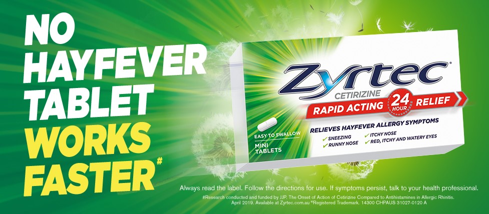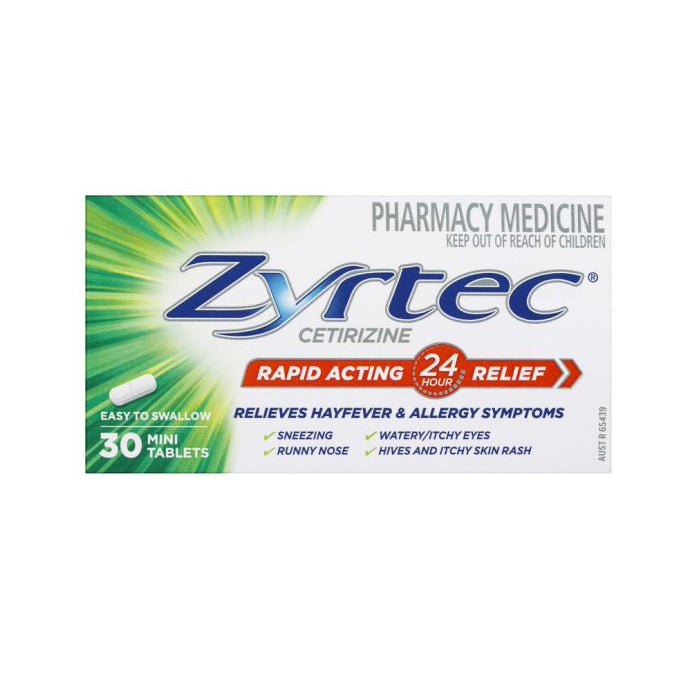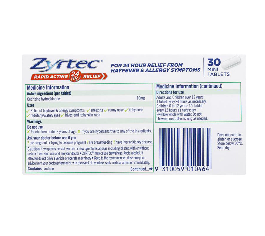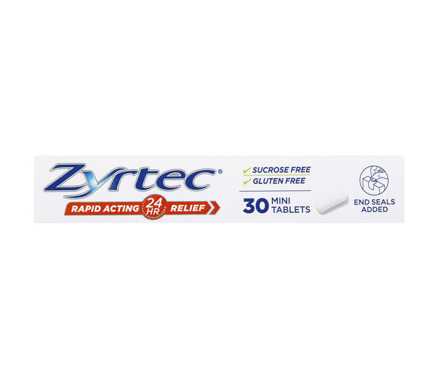 Zyrtec Cetirizine Rapid Acting Relief is an allergy & hayfever tablet that is easy to swallow and relieves hayfever and allergy symptoms such as sneezing, runny nose, watery eyes/itchy eyes, hives and itchy skin rash. Free from sucrose and gluten. End seals added.