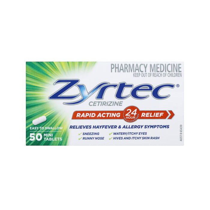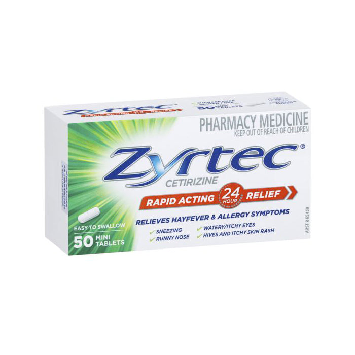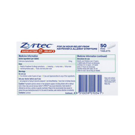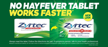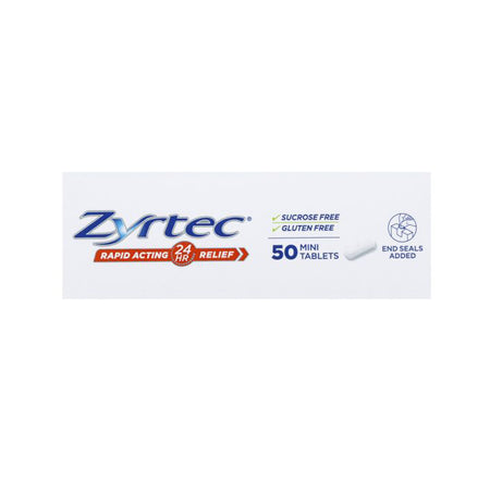 Zyrtec Cetirizine Rapid Acting Relief is an allergy & hayfever tablet that is easy to swallow and relieves hayfever and allergy symptoms such as sneezing, runny nose, watery eyes/itchy eyes, hives and itchy skin rash. Free from sucrose and gluten. End seals added.